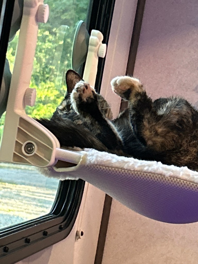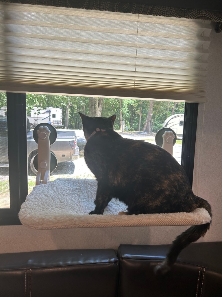 This is what has been a game changer! Ember loved the hammock that we had in the living room window back in our sticks and bricks home and I couldn’t bear to take it away from her. However, what we had was big, bulky, and would not work on the RV windows. This kitty hammock is PERFECT on the window above the dinette and she absolutely loves laying in it and sleeping the day away!