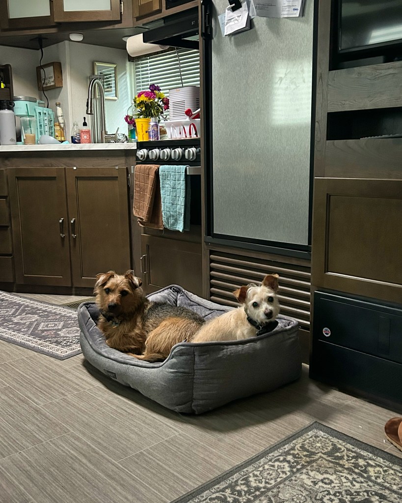 We bought this bed at TJ Maxx and the boys LOVE it! They will either sleep in it individually or together. We have another smaller bed for Marley (the Chihuahua) under the table in the dinette area. This bed fits perfectly under our fridge and doesn’t take up a ton of floor space. The use of dog beds and keeping the dogs off the furniture is a good way to save space and create boundaries. We try to keep them off the furniture as much as possible because let’s face it, there’s barely enough room for the two of us on the couch and bed! However, they do love sleeping on the people furniture when we aren’t looking!