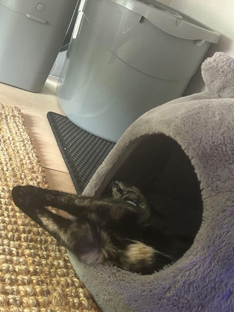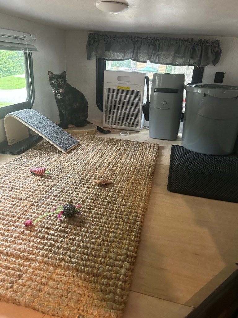 We weren’t using the bunks once we went full time in the RV, so we decided to turn the bottom bunk into Ember’s very own kitty condo! When we first moved into the RV she was a little timid and would hide back in the cubbies beside our bed. Once I got her kitty condo set up, she perked right up! Kitty condo has food/water, a scratchable rug, scratcher, litter box, litter genie, and an air purifier. I clean her litter box almost every day and the air purifier really helps with the smell. Walking in here, you wouldn’t know we had a cat onboard. Also, she loves her little bed that we threw in there too!