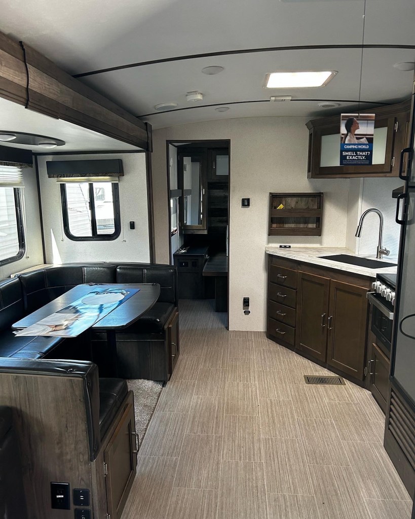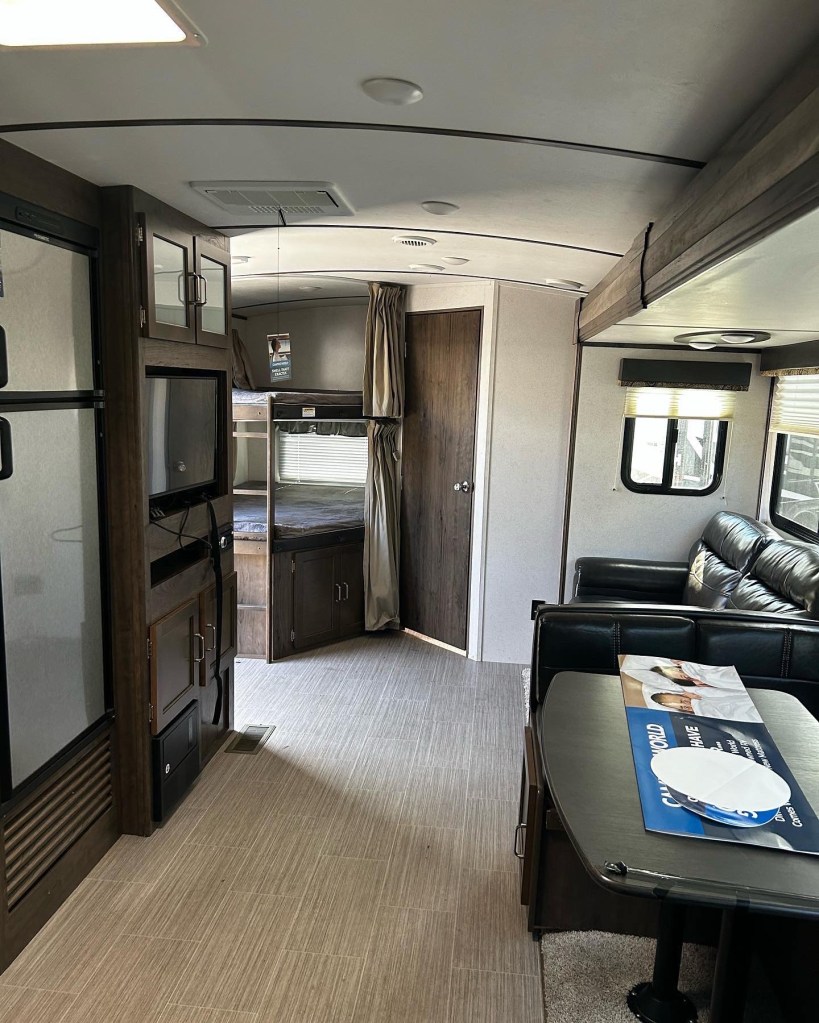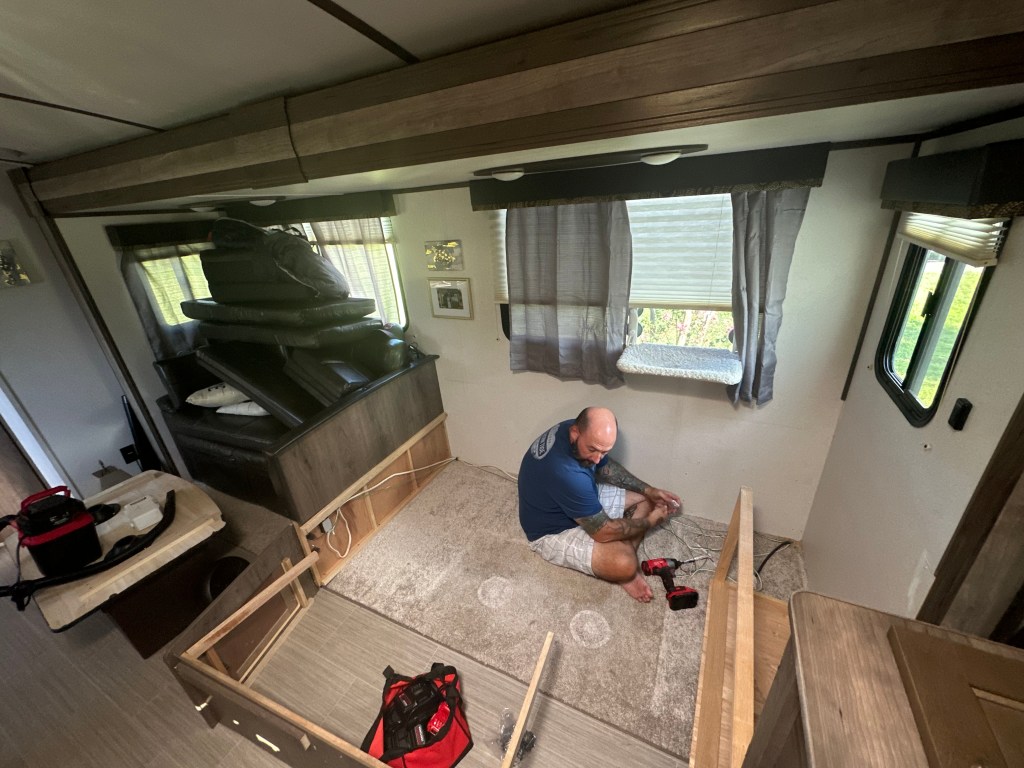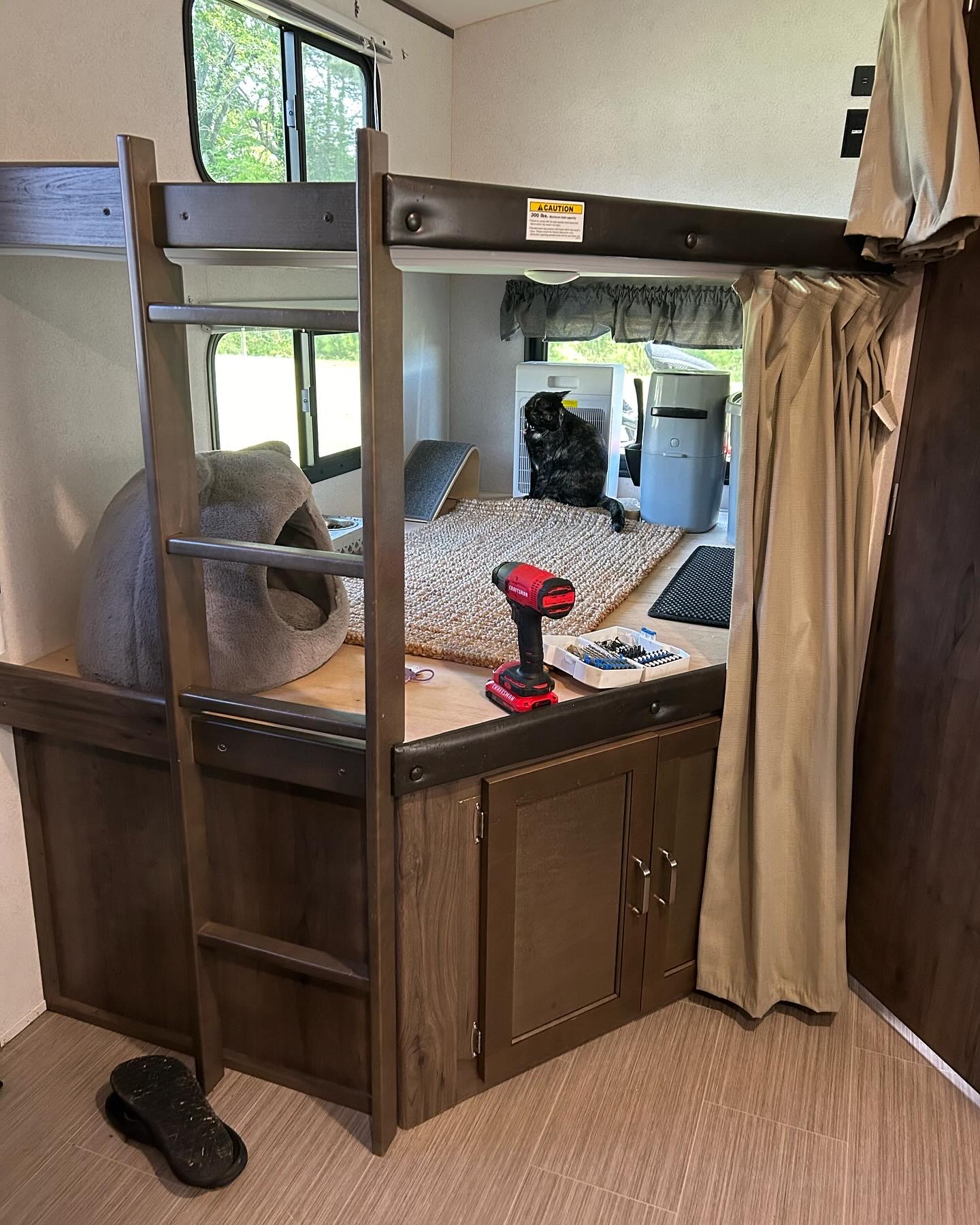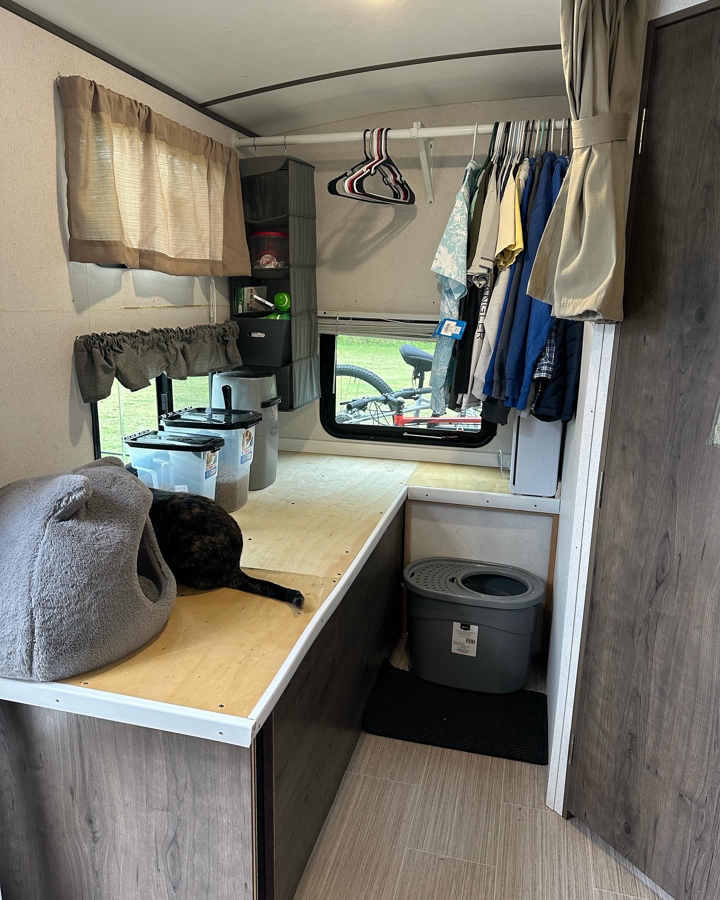 It wasn’t as easy to take out the bunks as it was the dinette, but we still got it done in one day. We weren’t able to take the whole bottom bunk out because part of it was covering up some of the outdoor kitchen. So we decided to preserve that as counter top space and a place for some of the kitty’s things. We put some finishing on the edges and around the wall and have plans to finish the top as well as paint the walls. We now have space to walk into the area and get to our storage and clothing as well as having a place for the litter box on the floor. Both of these renovations make the camper’s living space feel so much more open! It honestly feels like a brand new camper. I am loving making this place feel like HOME!