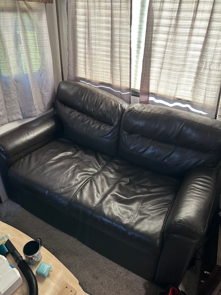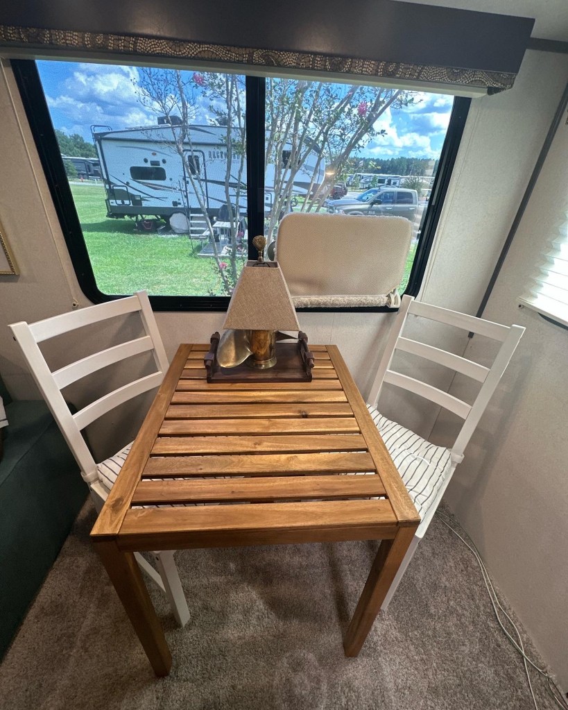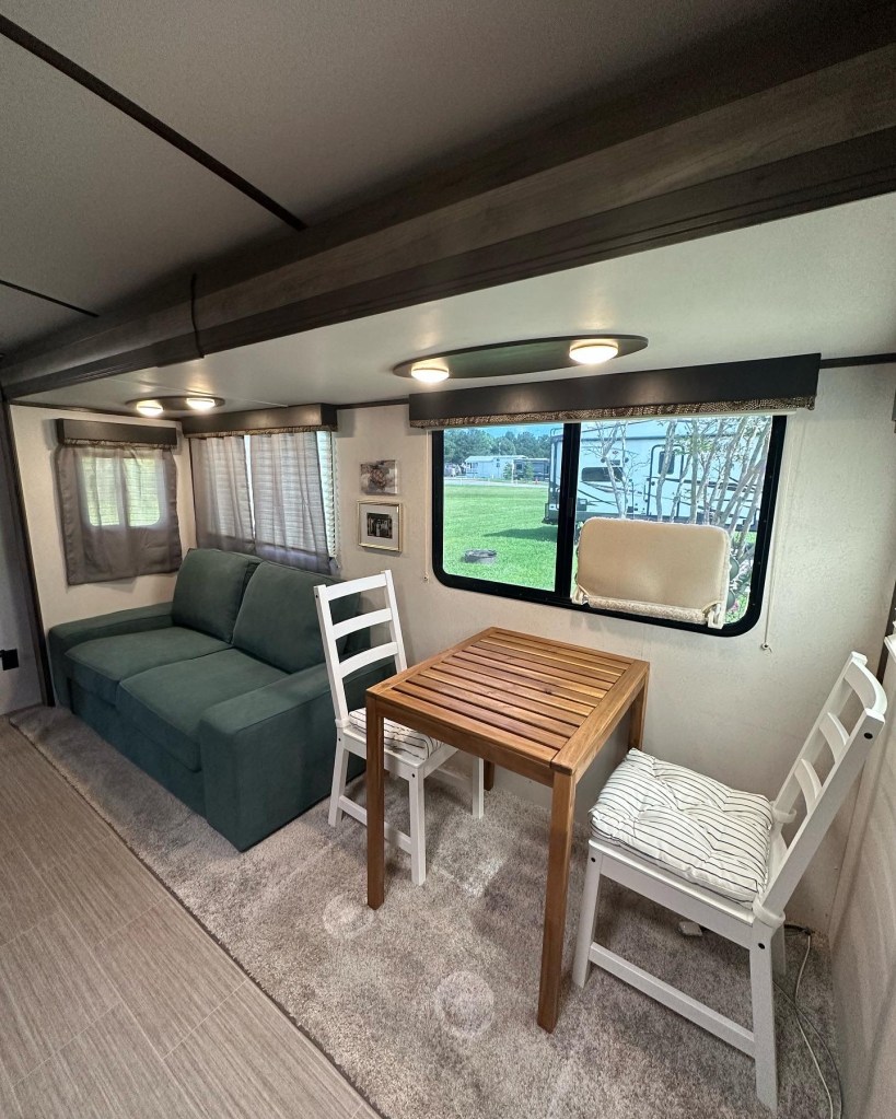 So we will be busy for the next month and a half and have been enjoying the slower weeks here at the campground. We have done some remodeling of the camper to make it feel more homey. We took out the U-shaped dinette and horribly uncomfortable couch and put in some Ikea pieces! We chose Ikea because the furniture came in boxes that was small enough to fir through the RV door. That is very important when considering a new furniture purchase for your RV. Another reason we went with Ikea was that it was more cost effective than the aftermarket “upgraded” furniture from places like RecPro and Thomas Payne. We loved their stuff, but we got a couch and dining table/chairs set for less than what we would have payed for one Thomas Payne couch so we settled for the more economical option.